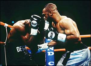Roy Jones gives Richard Hall the double jab against the ropes.